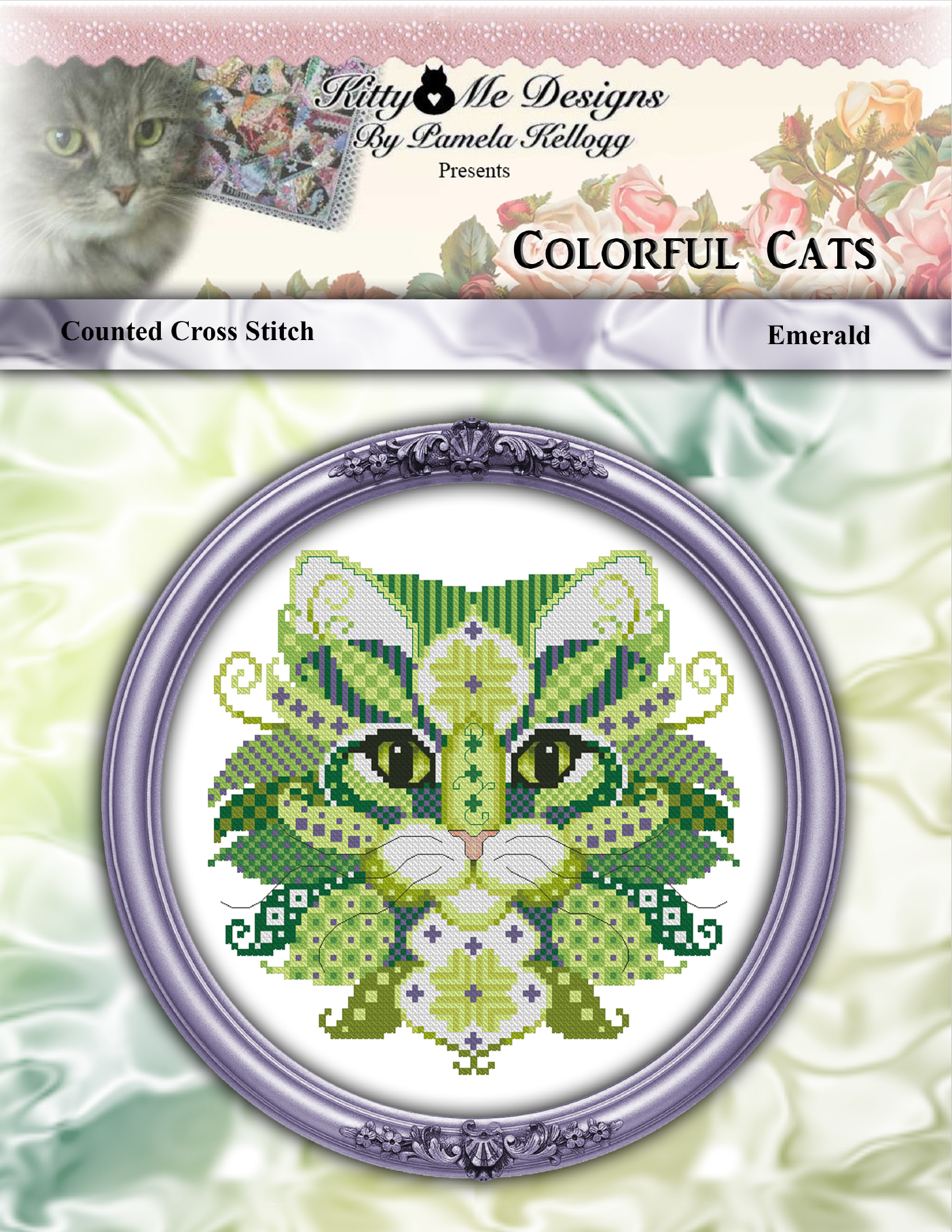 Emerald is a modern, geometric cat design in shades of green and purple with a St. Patrick's Day theme. Kreinik metallic braid adds a touch of sparkle, giving this Irish-themed design a bright, festive look.