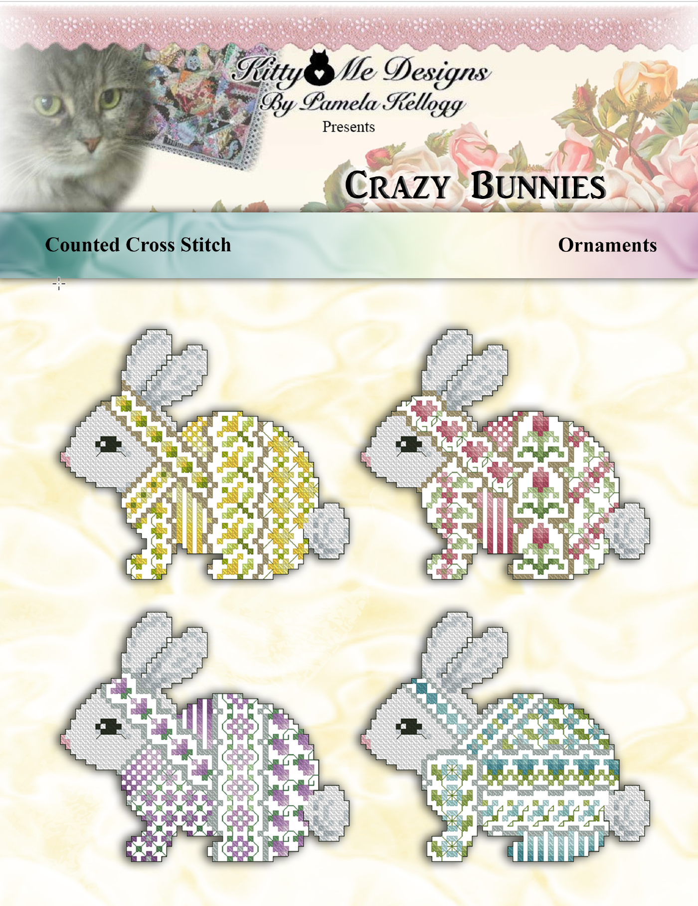 Four sweet little Easter bunnies in pastel Spring colors are worked in the style of Crazy Quilting. Stitch them on 14 ct Aida or Perforated Paper. A touch of Kreinik metallic adds some pretty sparkle. Finish into ornaments or magnets.