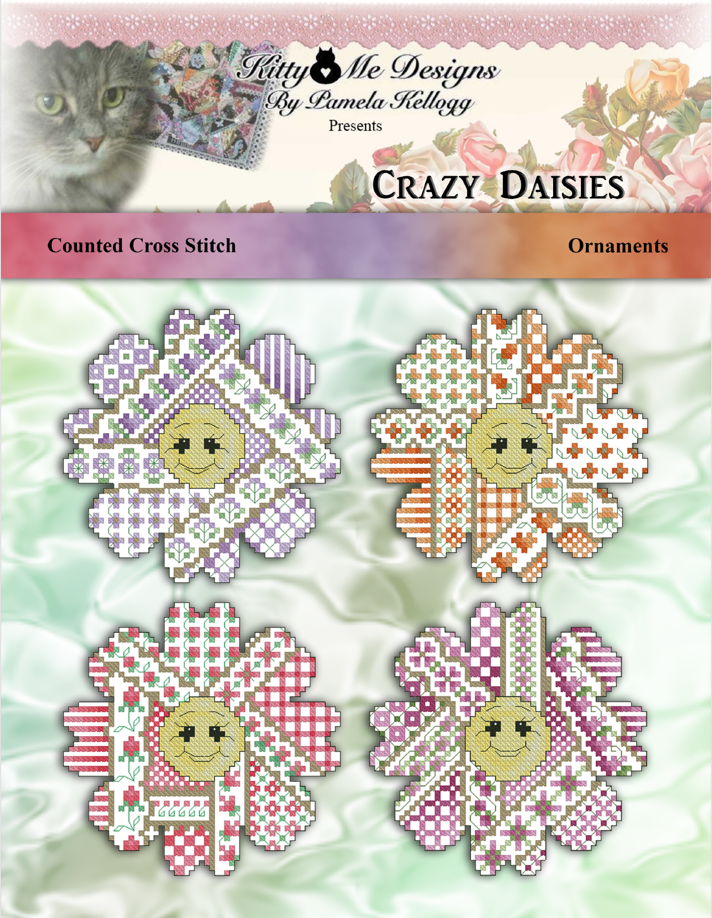 A set of 4 cute cross stitch daisy flowers worked in a crazy quilt style, perfect to stitch for Spring and Summer. A bit of Kreinik metallic gives these pretty little designs a touch of sparkle!