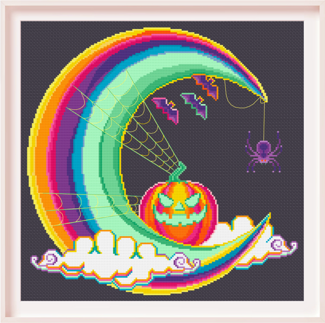 Brighten up spooky season with Halloween Moon β a bold, colorful design featuring a crescent moon wrapped in rainbow hues, a jack-oβ-lantern, cobwebs, bats, and a dangling spider. This vibrant Halloween pattern combines festive whimsy with striking neon-inspired colors, making it the perfect project for modern stitchers who love seasonal stitching with a twist.