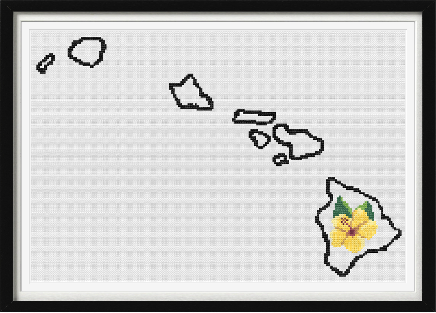 Hawaii & Yellow Hibiscus Outline Map Black Cross Stitch Pattern