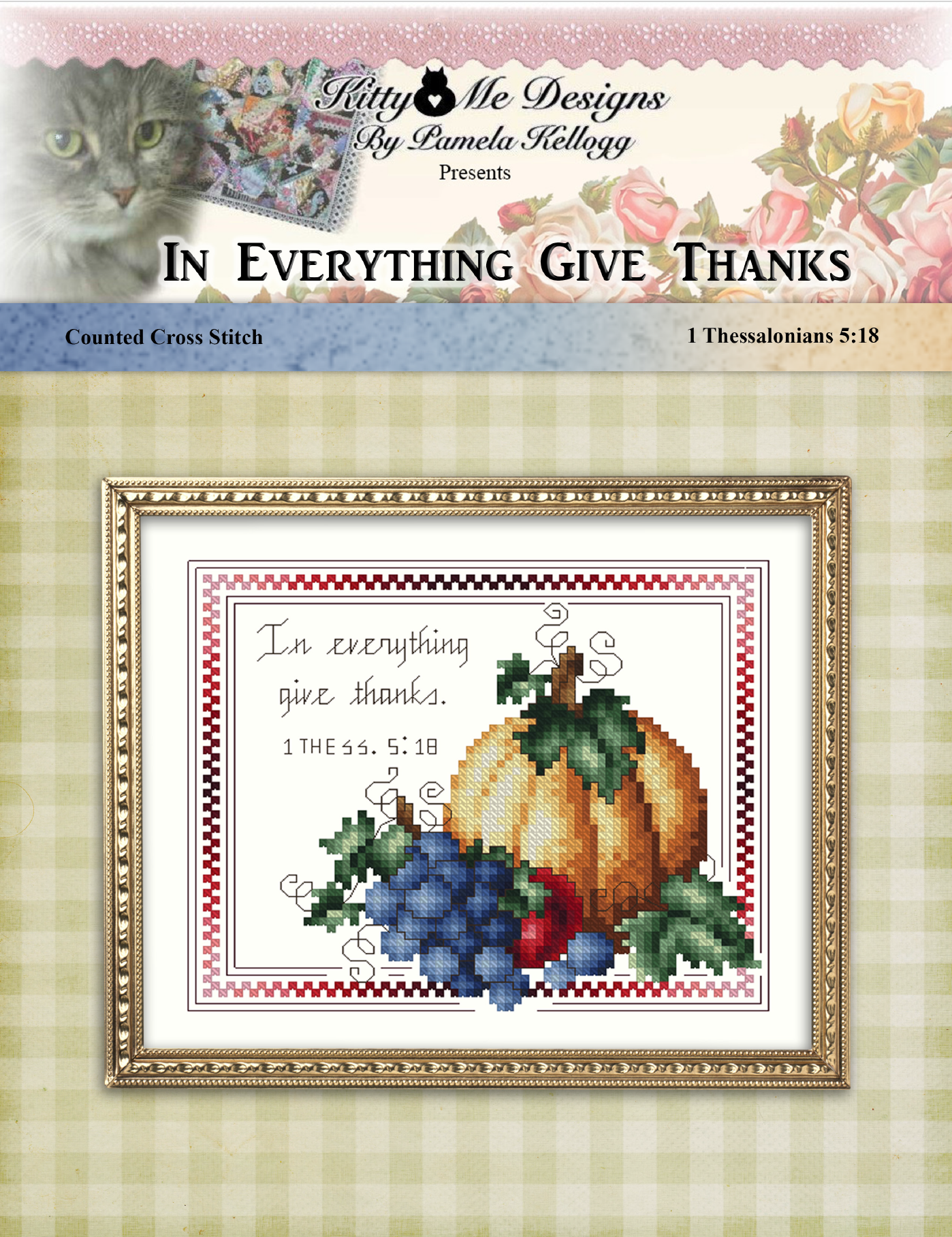 A perfect pattern for Thanksgiving or year-round kitchen decor! This Autumn-themed cross stitch features the Bible verse, "In Everything Give Thanks" from 1 Thessalonians 5:18. Designed by Pamela Kellogg.