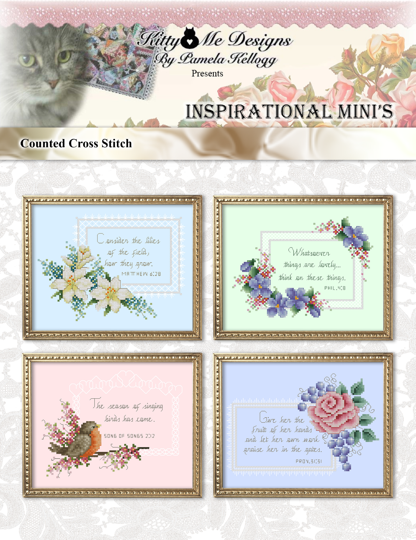 A set of 4 small cross-stitch patterns featuring Bible verses adorned with flowers. Perfect for thoughtful gifts or decor. Designed by Pamela Kellogg.