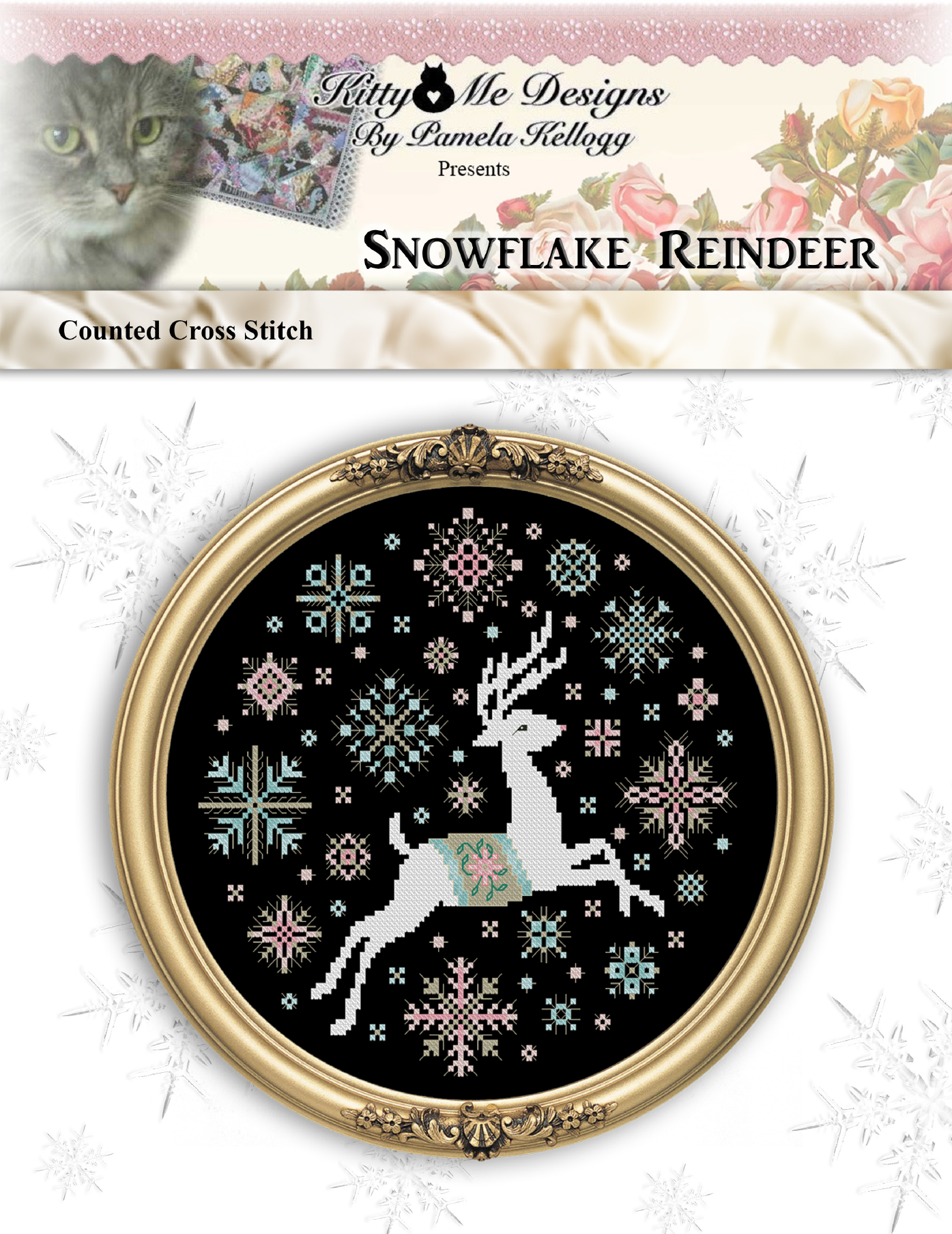 A beautiful white reindeer surrounded by pastel-colored Christmas snowflakes. This modern cross-stitch design is perfect to display for the entire Winter season! Kreinik metallic braids give this lovely project a touch of sparkle!