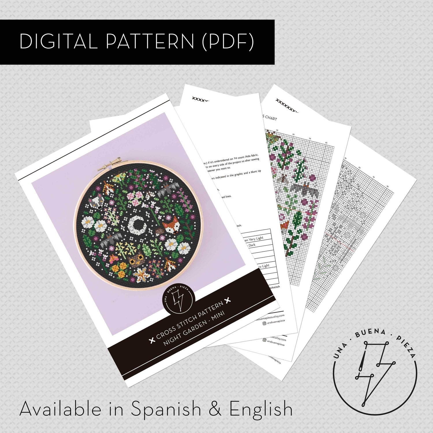 Step into a very special mini night garden where plants and animals come alive when the sunlight fades. This counted cross stitch design by Una Buena Pieza is inspired by nature at night, when the world grows quiet and activity begins under the stars. Softly illuminated by silvery moonlight at the center of the design, this peaceful garden invites you to slow down and explore its hidden details. Finished in a 20 cm (8 inch) embroidery hoop, this mini version makes a beautiful and calming decorative piece.