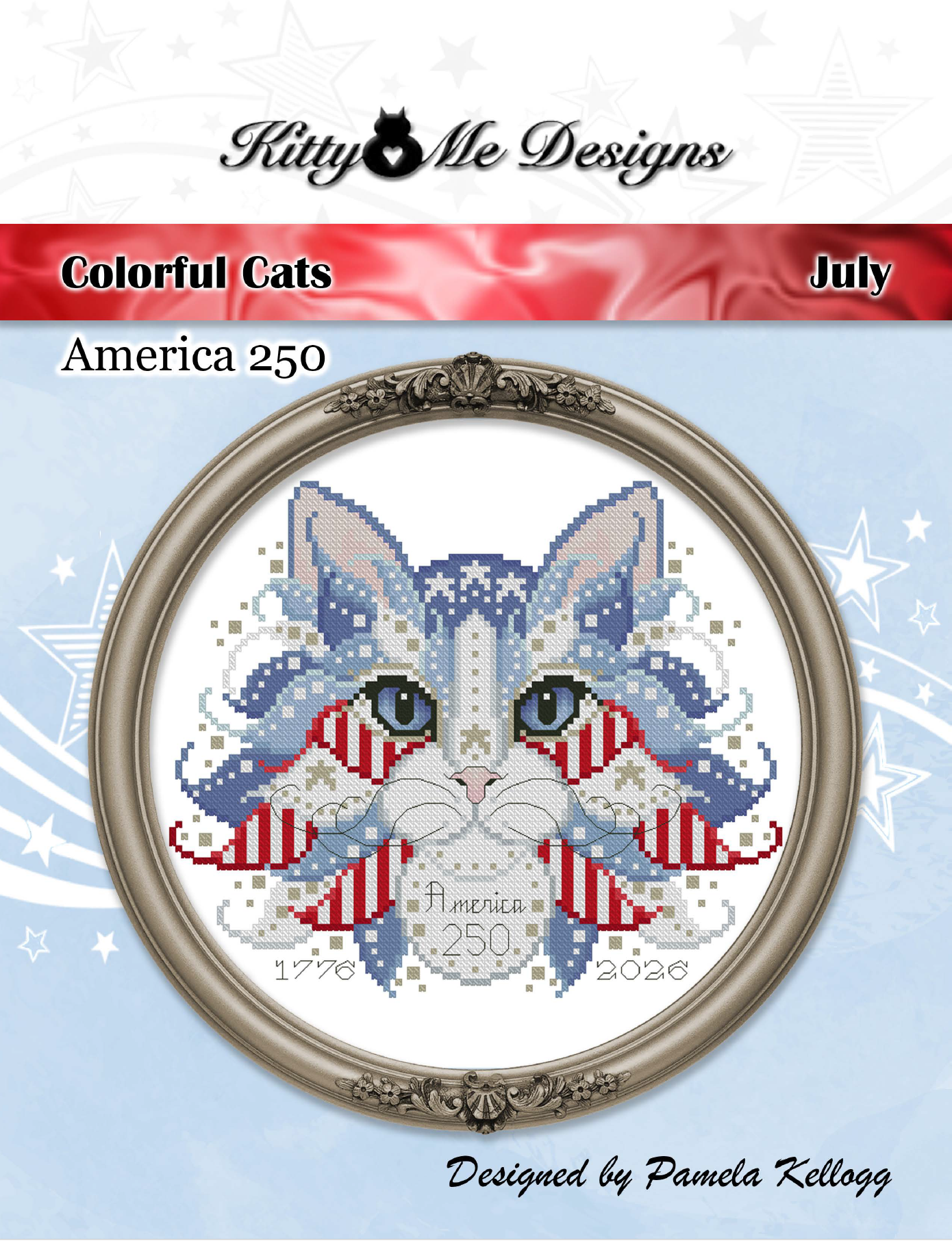 Celebrate America’s 250th anniversary with this patriotic addition to the Colorful Cats collection. Colorful Cats July – America 250 blends classic red, white, and blue tones with intricate ornamental details and metallic accents for a bold, commemorative design. Perfect for stitchers who love festive themes and expressive feline portraits.