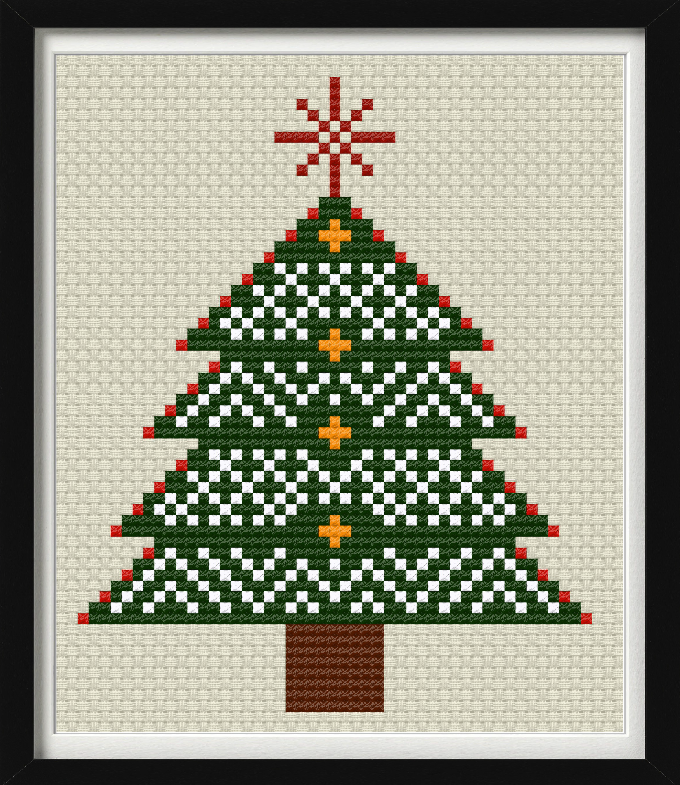 Scandi Tree is a clean, modern holiday design inspired by Nordic folk art and minimalist Christmas décor. With its balanced geometric shapes, muted color palette, and symmetrical ornament details, this tree brings a calm, cozy Scandinavian feel to your seasonal stitching. A perfect project for lovers of simple, timeless holiday designs.