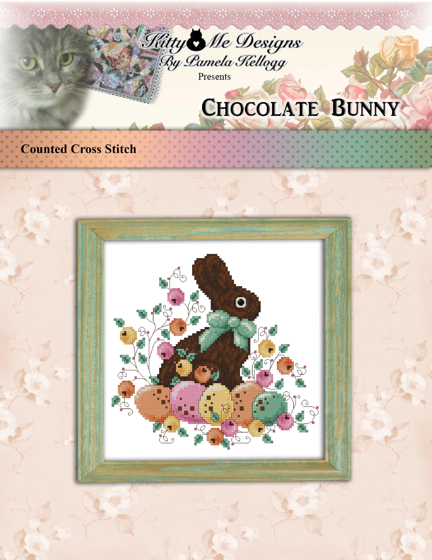 New for Spring 2019, this adorable chocolate bunny cross stitch pattern is surrounded by pastel-colored eggs and budding flowers.