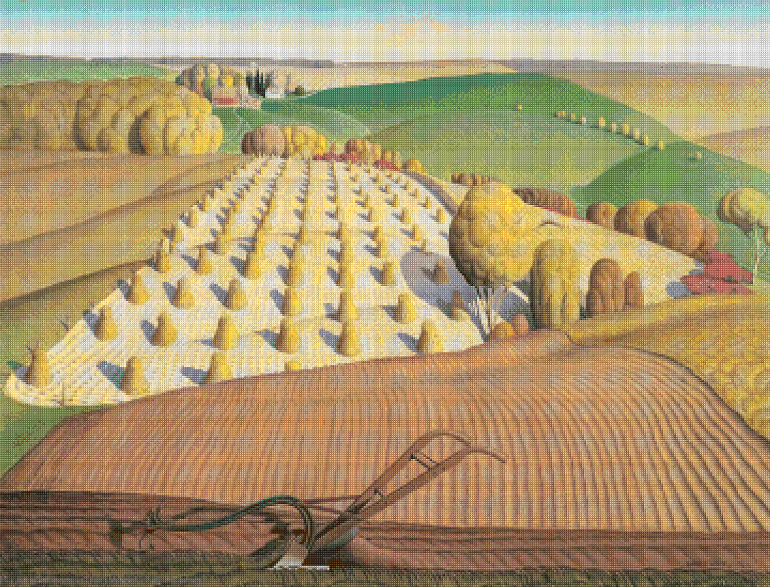Celebrate America’s heartland with Fall Plowing by Grant Wood. Painted in 1931 and now part of the John Deere Art Collection, this luminous view of freshly turned fields captures the spirit of American Regionalism — harmony, structure, and pride in the rural landscape. This full-coverage, fine art design is available in five finished sizes with regular and large-print charts for easy reading. Detailed instructions and a floss amount conversion chart make it simple to recreate Wood’s sculptural hills and glowing harvest tones in exquisite detail.
