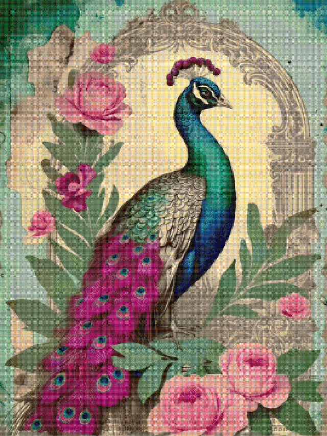 Celebrate the decorative elegance of the Art Nouveau era with Art Nouveau Peacock with Roses. This refined, full-coverage cross stitch pattern features a jewel-toned peacock framed by blooming roses, flowing botanical motifs, and an ornate arch. Inspired by classic Art Nouveau design, the composition blends graceful curves with rich color, creating a timeless, gallery-worthy piece that shines with ornamental beauty.