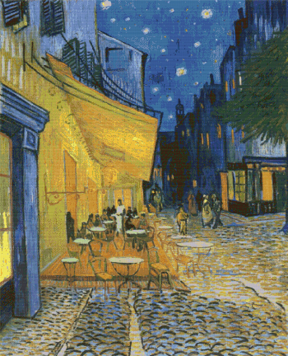 Recreate the enchanting atmosphere of a starlit evening in Arles, France, with our Café Terrace at Night cross stitch pattern. Inspired by Vincent van Gogh’s iconic 1888 masterpiece, this design captures the warmth and charm of a cozy café under a brilliant night sky. As you stitch, you’ll bring to life van Gogh’s expressive brushwork, vibrant colors, and the inviting glow that has made this painting a timeless favorite.