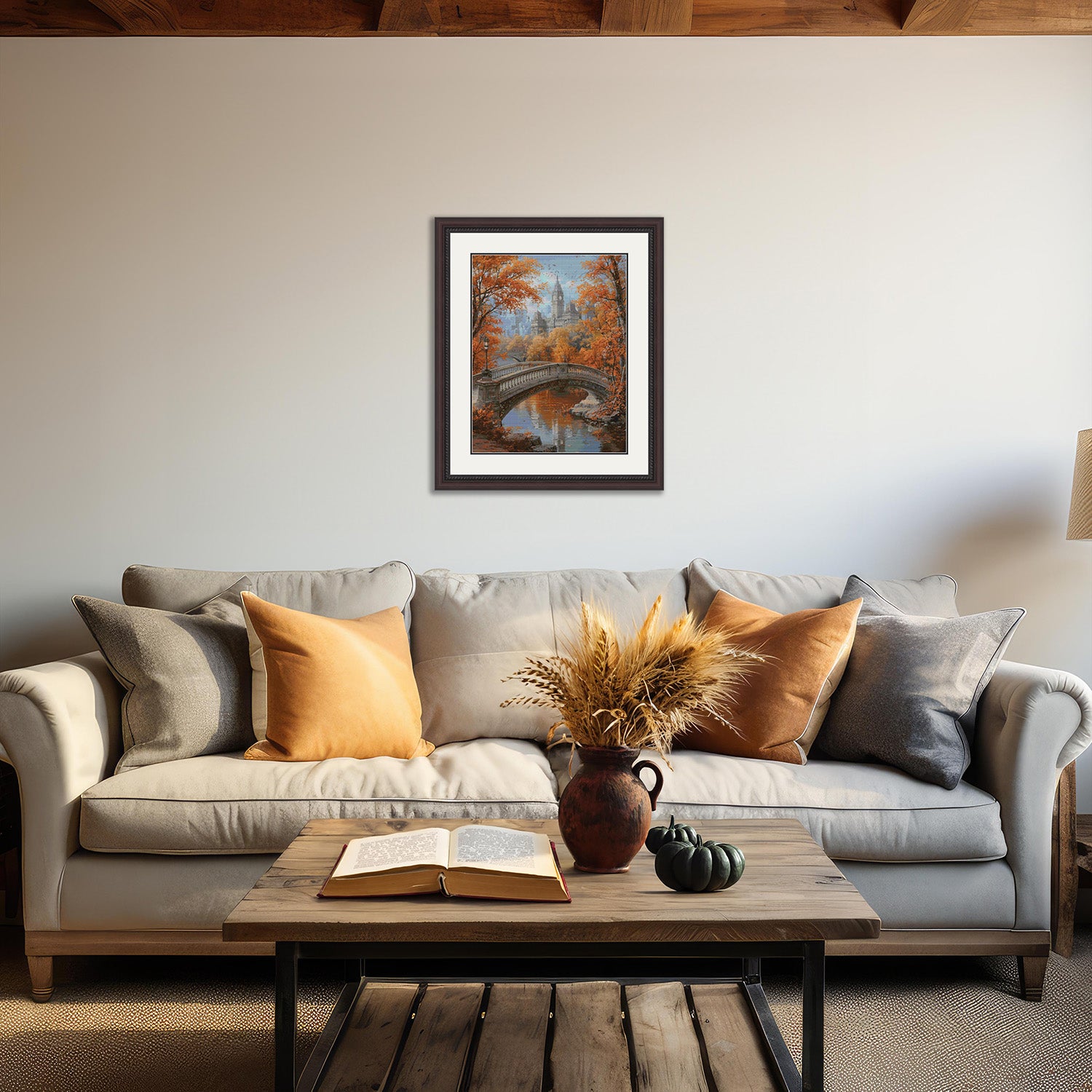 Celebrate the beauty of fall with Stone Bridge in Autumn. This full-coverage, fine art cross-stitch pattern features a graceful stone bridge reflected in the water, framed by trees with rich orange foliage and an early 19th-century city skyline in the distance.